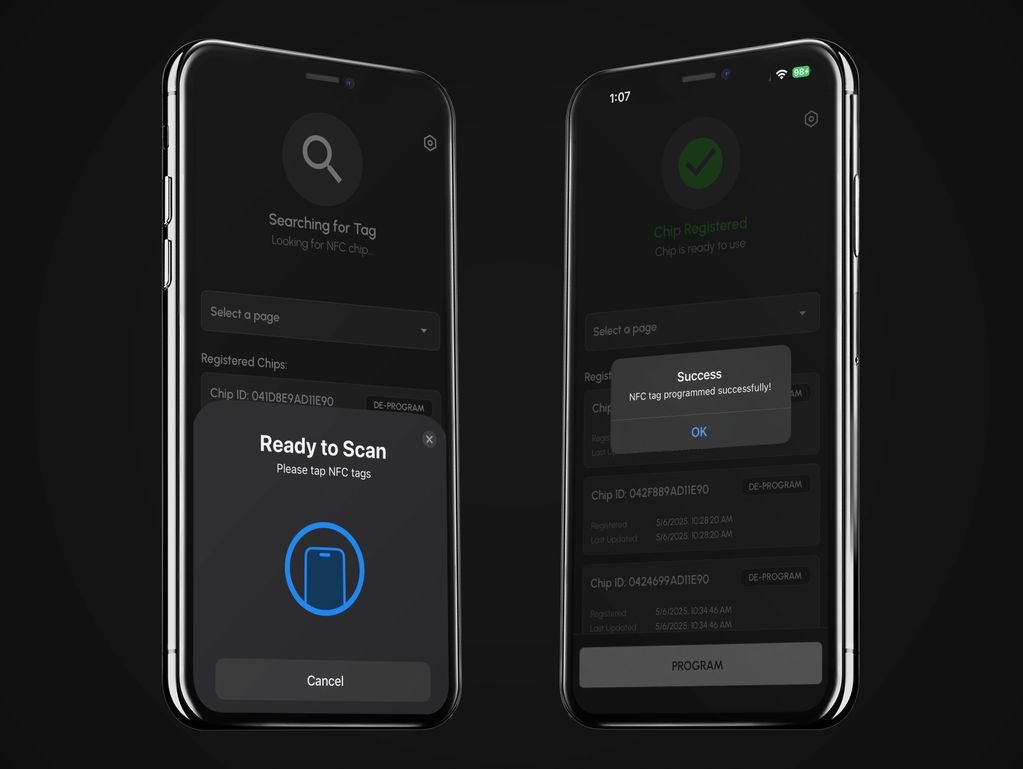 Download the VeriLink Programmer app and log in using your same credentials. Your pages will be ready to program into your NFC chip.